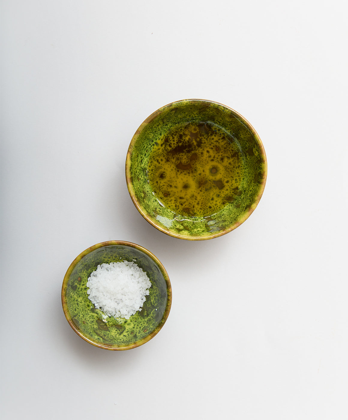 Each piece is handmade; sizes will vary. Approximate sizes: Oil: 4" W x 1.75" H; Salt: 3" W x 1.5" H