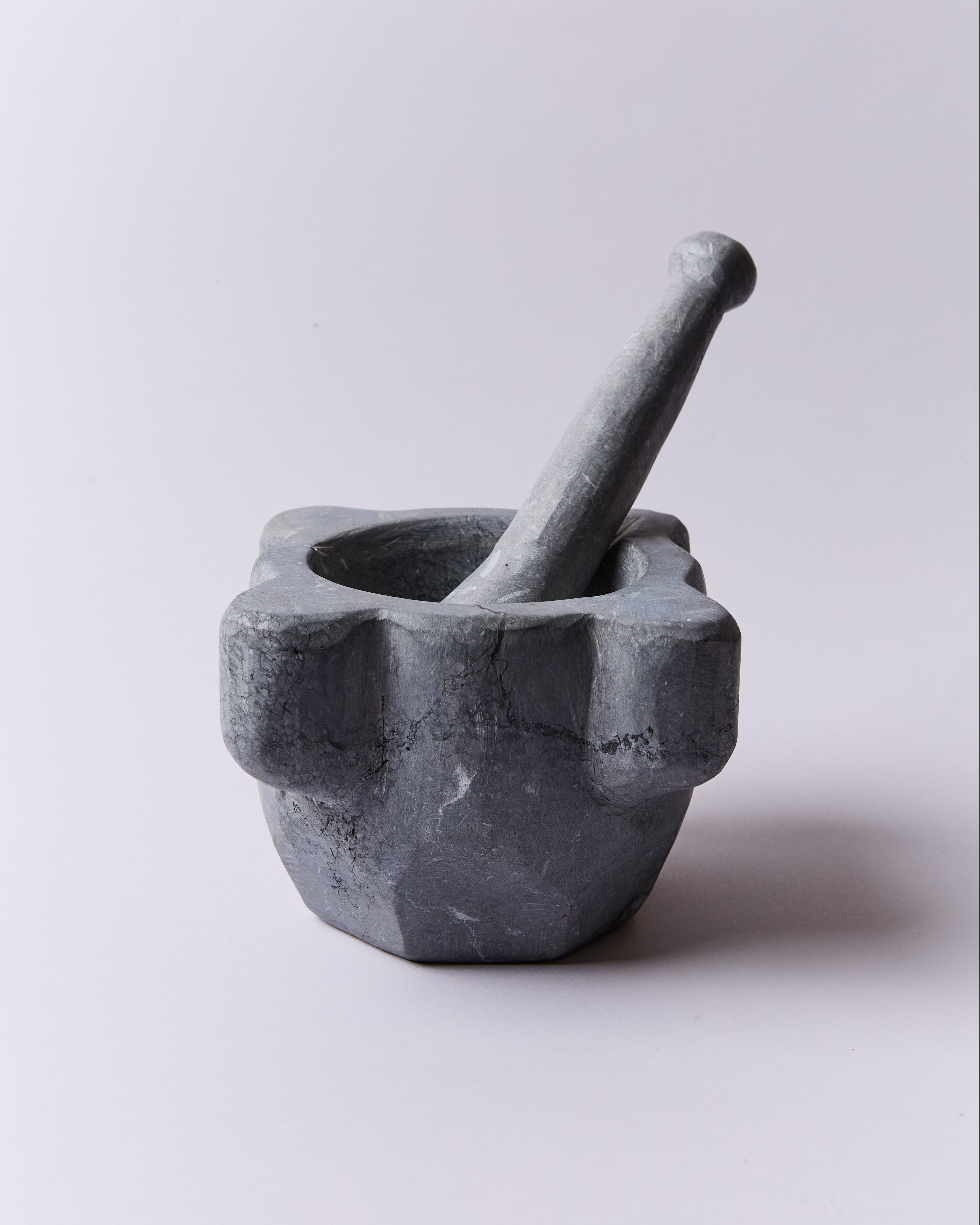 Hand-chiseled in Italy from Carrara marble, each mortar and pestle set is distinct. Ideal for blending herbs and spices, aioli and pesto. For more information or to select a specific piece please email vitainfo@ilbuco.com or call 917-261-2248. Approximate Dimensions (15cm diam x 13cm height)
