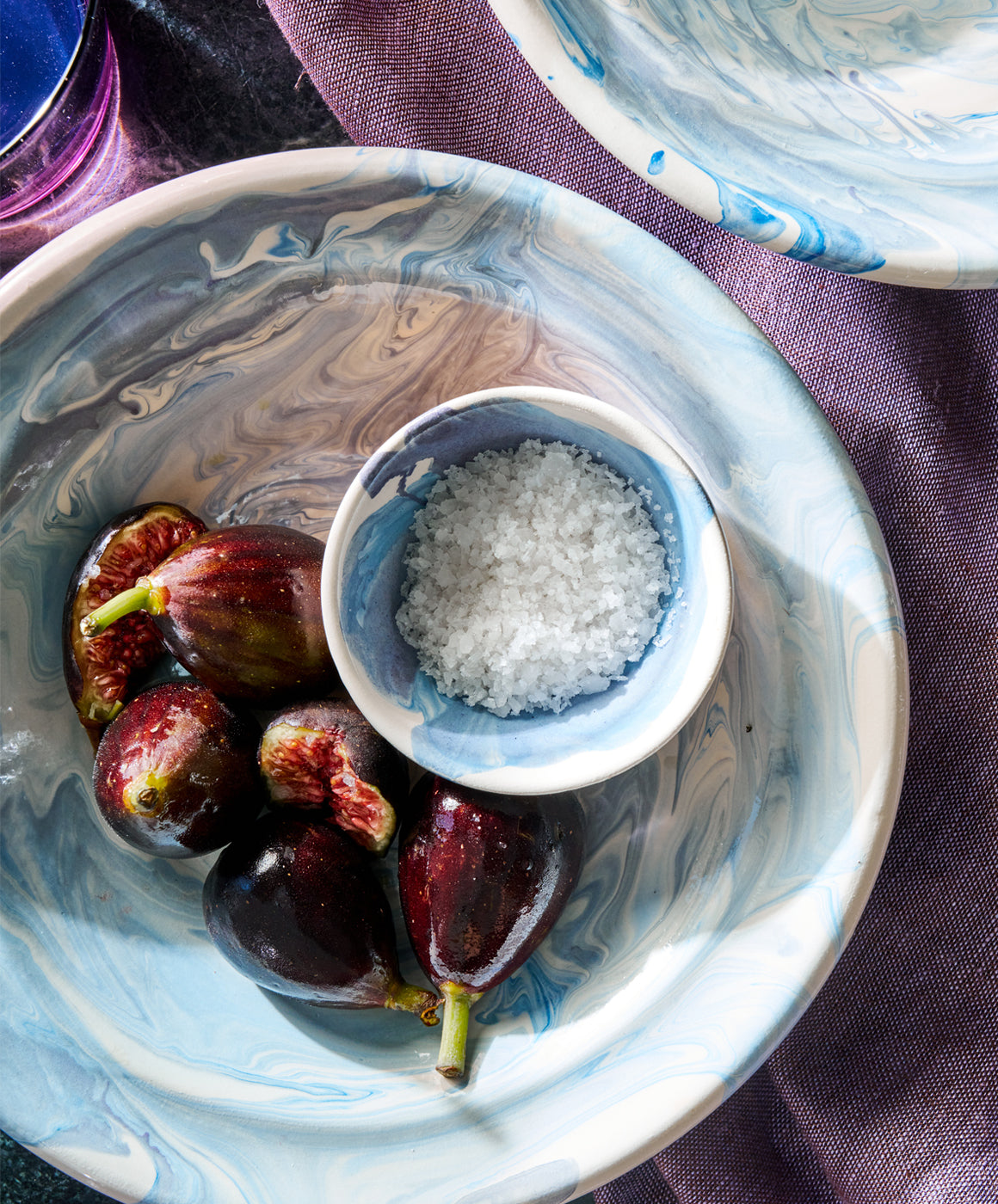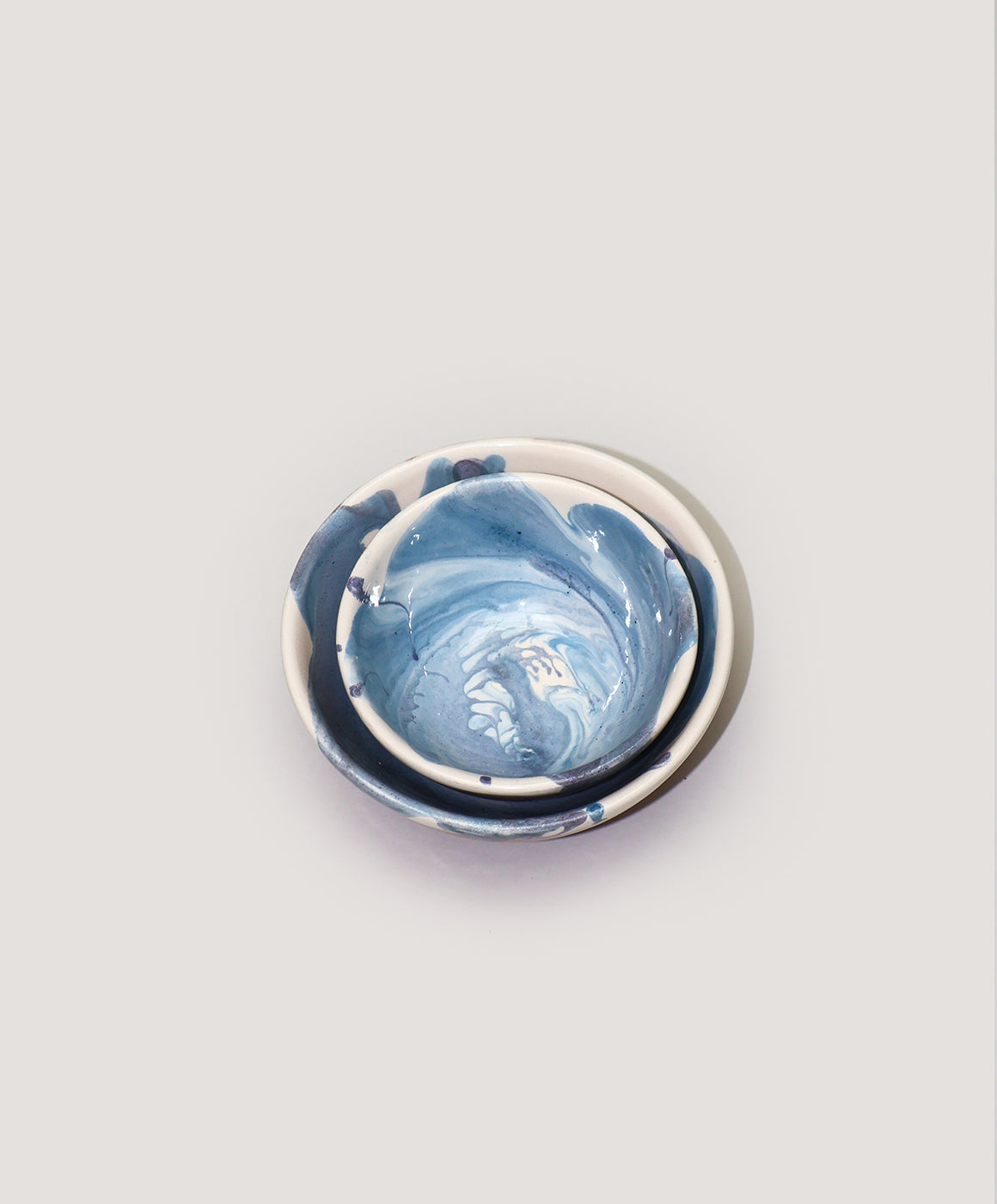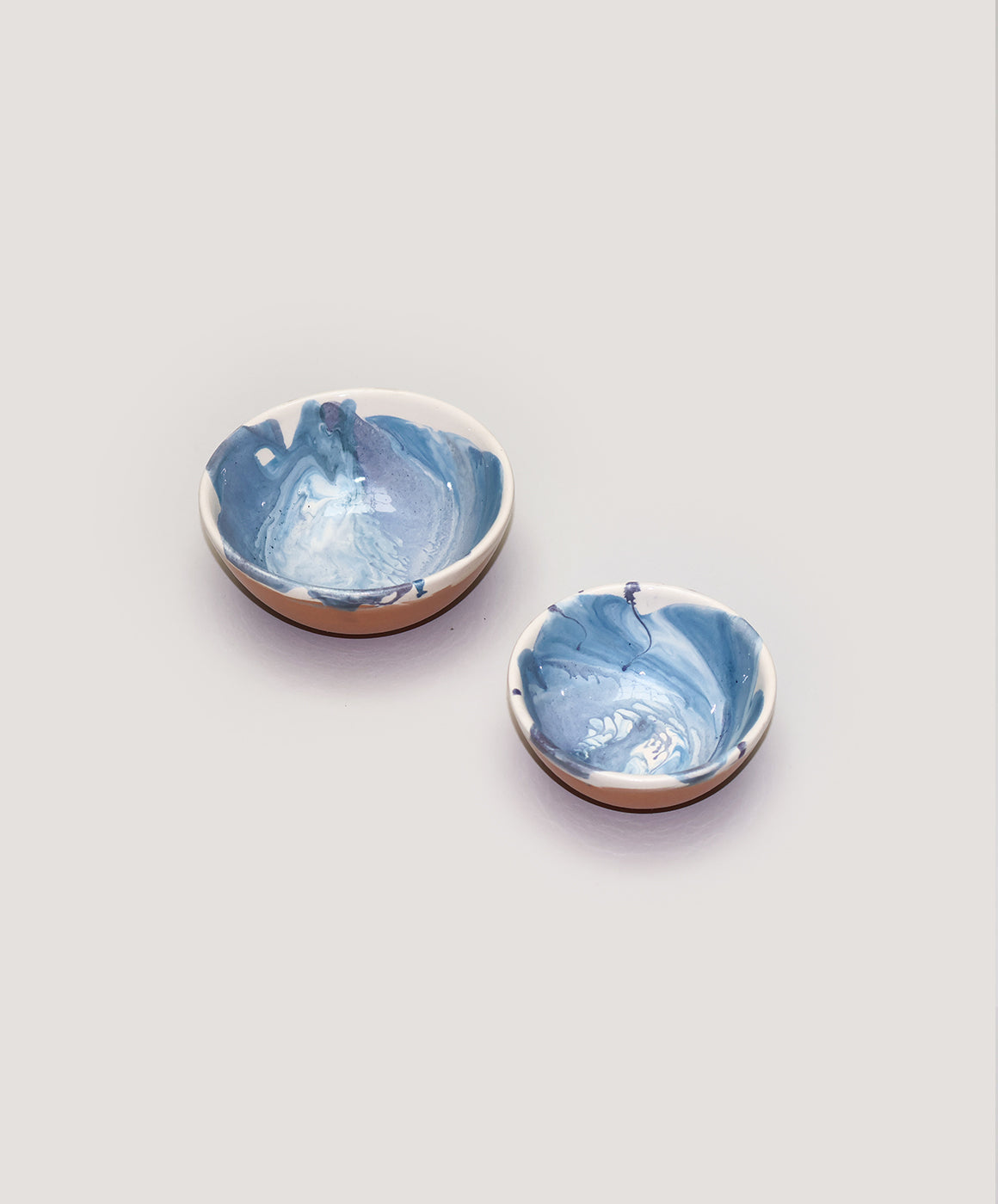 The Marea collection reflects the ebbing and flowing movement of the sea. Hand thrown terracotta and hand glazed application results in varying swirls and patterns that echo the undulating patterns of the tide. Each piece mimics the variety of nature, including varying depths of color and slightly differing shapes. No two pieces are the same.