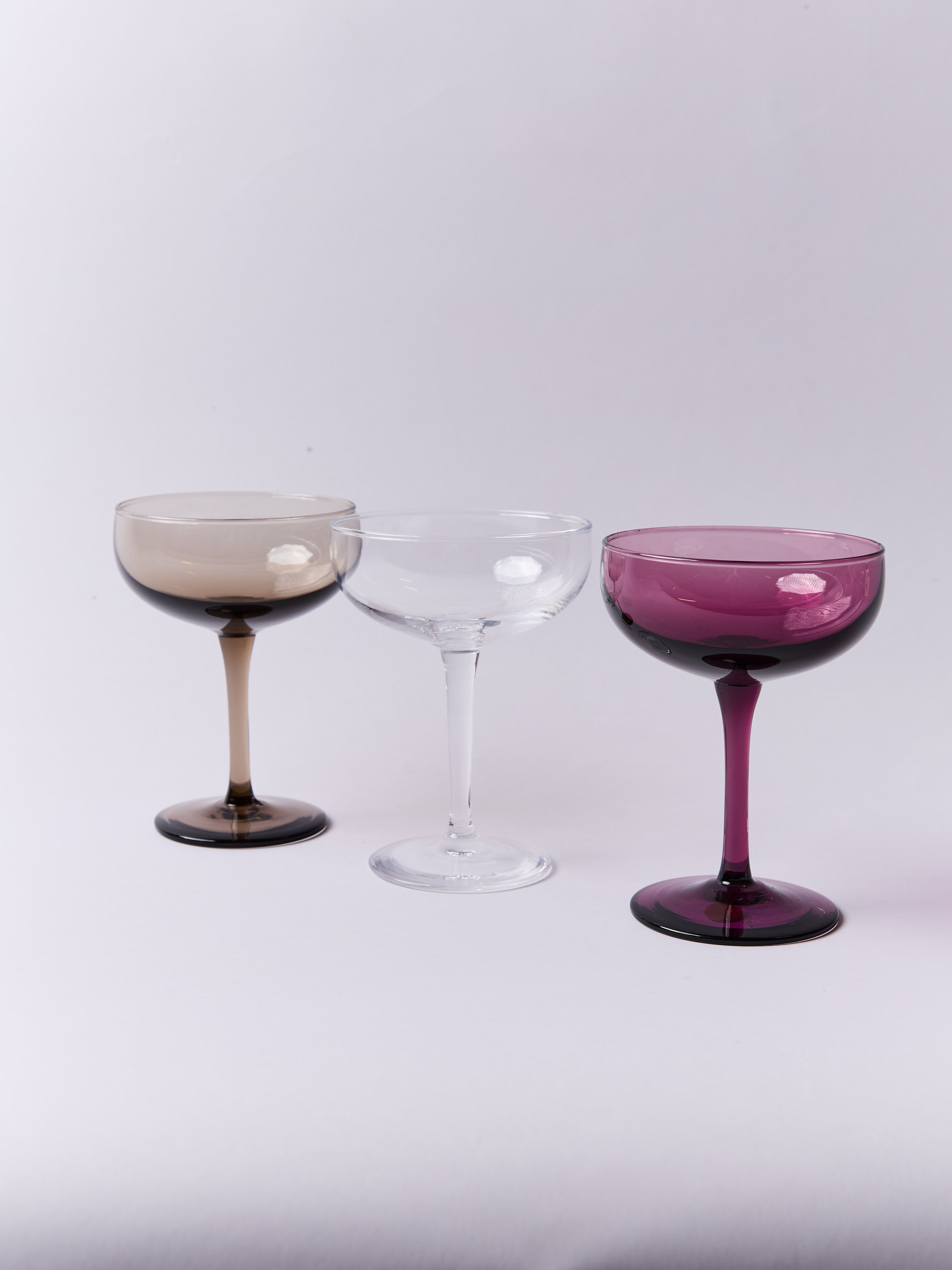 The Pienza coupe glass delivers understated elegance through its handblown craftsmanship. Whether presenting an expertly mixed cocktail, champagne, or a delicate dessert, this refined vessel adapts gracefully to any occasion. Its sculptural form adds colorful dimension in each of its three distinctive colorways —Smoke, Amethyst, and Clear. To maintain its pristine condition, handle gently and keep away from microwaves & heat.