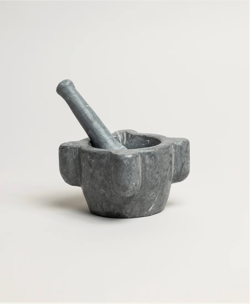 Hand-chiseled in Italy from Carrara marble, each mortar and pestle set is distinct. Ideal for blending herbs and spices, aioli and pesto. For more information or to select a specific piece please email vitainfo@ilbuco.com or call 917-261-2248. Approximate Dimensions (15cm diam x 13cm height)
