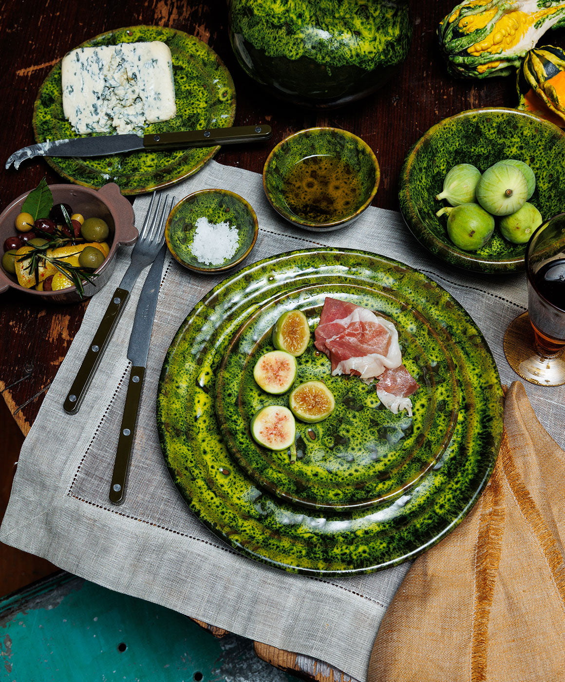 Inspired by the undulating hillsides of the Umbrian woods. The "Bosco" or Forests covered in moss creates a unique pattern under the trees which led Antonello Radi to design this special glaze technique on red terracotta. A truly unique collection that appeals to the most refined modern and rustic tables alike.